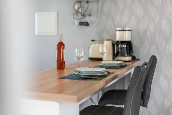 Die funktional gestaltete Wohnung hat einen offenen Wohnbereich mit Küche, gemütlicher Sitzecke, ein Schlafzimmer mit Doppelbett und eine Terrasse. Der Küchenbereich ist mit 2-Platten-Kochfeld, Kühlschrank mit Gefrierfach, Kaffeemaschine und div. Geschirr ausgestattet. Ein Bad mit Fenster, Dusche, Waschbecken und WC komplettieren den Gesamteindruck der Wohnung.