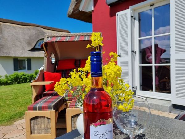 Auf der möblierten Terrasse haben Sie den ganzen Tag Sonne und Sie können den Blick über die Felder bis hin zum Erholungsort Zierow schweifen lassen. Eine gemütliche Sitzlounge lädt zum Entspannen und Bücher lesen ein. Die Terrasse ist mit einer elektrischen Markise versehen. Im Garten ist ein Grill und ein Gartenhaus zum Unterstellen Ihrer mitgebrachten Fahrräder. Im Reethaus erwartet Sie eine komfortable, hochwertige Ausstattung. Im gesamten Haus ist eine Fußbodenheizung und Fliesen verlegt. Im Erdgeschoss befindet sich das Wohnzimmer mit Kamin. Machen Sie es sich auf der großen Wohnlandschaft gemütlich - Spiele, Bücher, DVD`s, Sat-TV mit DVD sorgen für Unterhaltung. W-LAN ist kostenfrei nutzbar. Eine Waschmaschine steht im Hauswirtschaftsraum bereit. Die Küche ist separat und lädt zum Kochen ein. Der Essbereich ist hier integriert. Die Küche ist mit Geschirrspüler, Ceran-Kochfeld, Backofen, Toaster, Kaffeemaschine, Radio, Kühlschrank mit Gefrierfach und vielen Kochutensilien ausgestattet.