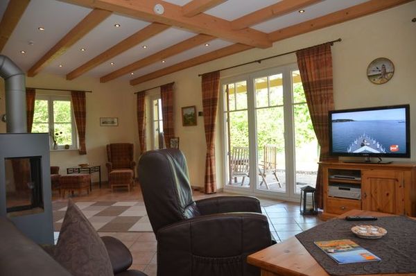 Der Wohnbereich ist komfortabel eingerichtet mit einer großen Eckcouch mit Sessel, einem Kamin, TV, DVD-Player und einer kuscheligen Leseecke mit 2 gemütlichen Ohrensesseln. Im Essbereich gibt es einen großen Esstisch für 6 Personen.