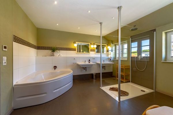 • Bad mit ebenerdiger XXL-Dusche, Eckbadewanne, Sauna, Doppelwaschtisch, WC, Handtuchtrockner und Fußbodenheizung