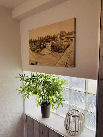 Unter dem Dach befindet sich ein gemütliches Schlafzimmer, ein großer moderner  Wohn- und Essbereich, welcher in die Küche übergeht. Über eine Treppe gelangen Sie in das Erdgeschoß, in dem  ein großzügiges Bad für Sie untergebracht ist. Ein großzügiger Außenbereich bietet den Gästen eine überdachte Terrasse und viel Parkraum an. Auf dem ehemaligen Speditionsgelände sind derzeit drei Ferienwohnungen untergebracht. WLAN, Fernseher in den Schlafzimmern und Wohnzimmern sowie eine moderne Waschküche im Keller sind Extras, welche im Preis inbegriffen sind.
