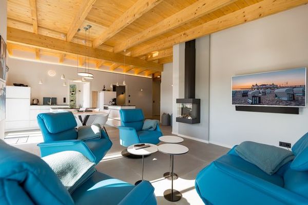 Exklusives und modernes Wohnflair mit Meerblick bietet dieses 84 Quadratmeter große barrierefreie Urlaubsparadies in seinen drei Räumen im Penthouse des Domizils Düne 8. Entspannen Sie hier mit bis zu 4 Personen und einem Kleinkind bis 3 Jahre (im Kinderreisebett). Eine hohe, offene Holzbalkendecke, stylische Designmöbel, ein moderner Gas-Kamin – eine Wohlfühlwelt, in der man wunderbar abschalten kann. Eine umlaufende Sonnenterrasse mit Meerblick (ges. 33m²)lädt zum Verweilen ein. So entspannend sollte Urlaub sein! Im Inneren erwarten Sie lichte und hohe Räume. Die Ledersessel vor dem großen Flat-TV im offenen und großzügig geschnittenen Wohn-Ess-Zimmer lassen sich bequem in eine Liegeposition verstellen, so dass jeder seine eigene, kleine Relax-Area bekommt. Verbindungsglied zwischen dem Wohnbereich und der mit hochwertigen Markengeräten voll ausgestatteten Küche ist ein wunderschöner Essplatz mit stylischem Esstisch im Industriallook und bequemen Schalensesseln. Die Küche ist absolut modern mit einer freistehenden Kochinsel, High End-Kochfeld mit integriertem Dunstabzug und edlem Geschirr eingerichtet. Die beiden Schlafzimmer – eines sogar mit Zugang zur großen Terrasse – verwöhnen mit Behaglichkeit und viel Stauraum. Komfortable Boxspringdoppelbetten (1,80 m x 2,00 m) sorgen für Schlafvergnügen und die passgenauen Einbauschränke bieten ausreichend Ablagefläche. In beiden Zimmern gibt es einen Flat-TV. Die beiden Tageslicht-Bäder verfügen über eine Regendusche, einen Waschtisch und ein WC. Ein kleines Highlight wartet darüber hinaus zusätzlich in einem der Badezimmer auf Sie: Entspannen und genießen Sie Ihre Auszeit erst so richtig in der eigenen, Finnischen Sauna. Da freut man sich sogar auf kühlere Abende oder ungemütliche Herbst- oder Wintertage. Sie wollen auch im Urlaub im Internet surfen? Kein Problem! Das WLAN ist kostenfrei. Für Ihren Komfort sind die Betten bei Ihrer Anreise bezogen. Und auch für Ihr Auto ist gesorgt. Einen überdachten Pkw-Außenstellplatz gibt es am Haus. Außerdem gehört zu der Wohnung ein eigener Fahrradabstellraum.
