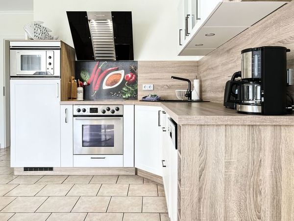 Die offene L-förmige Küche ist mit allen technischen Geräten ausgestattet, die man für ein komfortables Wohnen und Kochen benötigt, wie z.B. Spülmaschine, eingebautem Kühlschrank mit Gefrierfach, Mikrowelle, Cerankochfeld, Backofen, Dunstabzugshaube, Toaster, Wasserkocher und Filterkaffeemaschine.