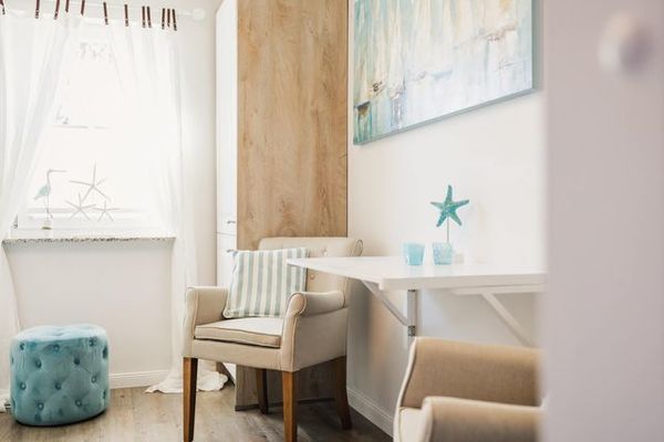 Edle Landhausoptik mit maritimen Akzenten: Lassen Sie sich vom stilvollen Ambiente mit liebevoller Dekoration verzaubern. Der Wohnraum u?berzeugt mit einer gemu?tlichen Essecke und einem modernen Flachbild-Fernseher. Entspannen Sie in unserem gemu?tlichen Apartment mit integrierter Kochnische.