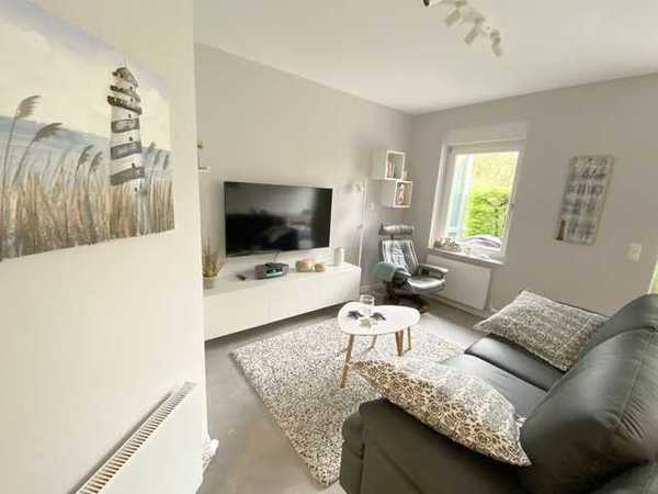 Liebevoll eingerichtete 2,5 Raum-Ferienwohnung (52m²) für bis zu 4 Personen im EG, mit Terrasse und gemütlichem Wintergarten im Wohnbereich, Sitzecke mit Flachbild-TV und Relaxstuhl, Essbereich im Wohnzimmer/Wintergarten.