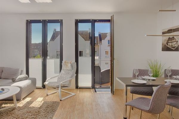Der offene Wohnbereich lädt mit einer gemütlichen Couch und einem Schwingsessel zum Verweilen ein. Smart-TV, Musikanlage, DVD-Player und WLAN stehen zur Verfügung, sodass auch im Urlaub Serien oder Filme gestreamt werden können. Bodentiefe Fenster lassen viel Tageslicht herein und bieten direkten Zugang zum möblierten Süd-Balkon, auf dem sich die Sonne genießen oder das Treiben der Umgebung beobachten lässt. Für ein angenehmes Wohnklima sorgt die Fußbodenheizung in der gesamten Wohnung.