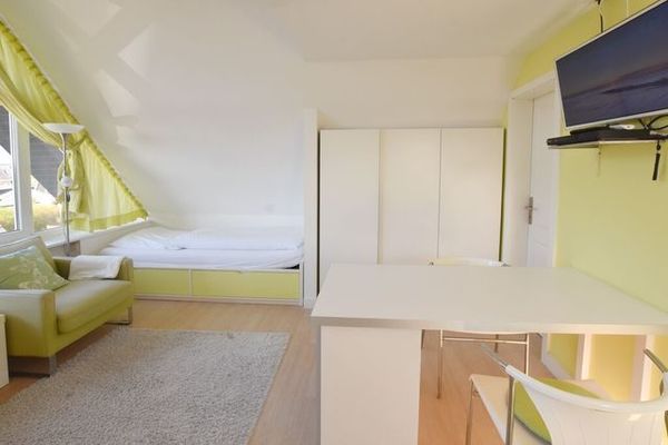 Modernes helles 1-Zimmer-Appartement (Dachgeschoss). Heller Kombinierter Wohn-Schlafraum mit 2 Einzelbetten, Lounge-Sessel, Küchenzeile und Duschbad. Im Garten des Hauses steht Ihnen ein Strandkorb zur Verfügung.