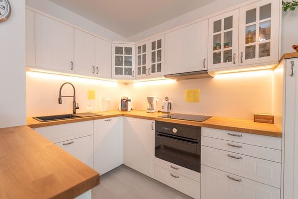 Das Herzstück der Wohnung ist der Wohn-/Essbereich mit einer voll ausgestatteten offenen Küche, die über ein Induktionskochfeld, eine Mikrowelle, einen Heißluftofen, einen Kühlschrank mit Gefrierfach und einen Geschirrspüler verfügt. Ein gemütlicher Essplatz mit vier Stühlen und eine bequeme Eckcouch laden zum Verweilen ein. Zur Unterhaltung stehen ein 50-Zoll-TV und ein Internetradio bereit. Die Couch kann bei Bedarf zu einem Schlafplatz (140 x 200 cm) umfunktioniert werden.