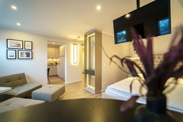 Der Wohn-Schlafraum in diesem stilvollen und mit allem Komfort ausgestatteten Apartment bietet alles, was Sie für einen behaglichen Aufenthalt benötigen. Modernes Interieur, eine voll ausgestattete Küche und eine einladende Sitzecke schaffen eine unvergessliche Wohlfühlatmosphäre. Ein absoluter Pluspunkt für die warmen Sommermonate ist die vorhandene Klimaanlage, die für angenehme Temperaturen sorgt und Ihren Aufenthalt noch angenehmer macht.