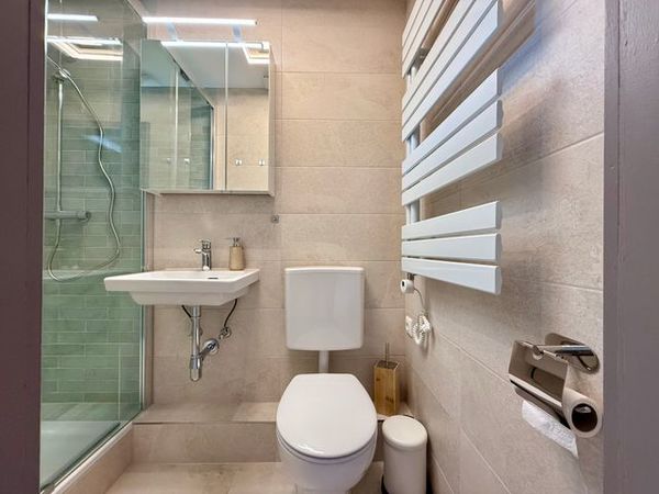 Das moderne Badezimmer verfügt über eine Dusche, ein WC und ein Waschbecken.