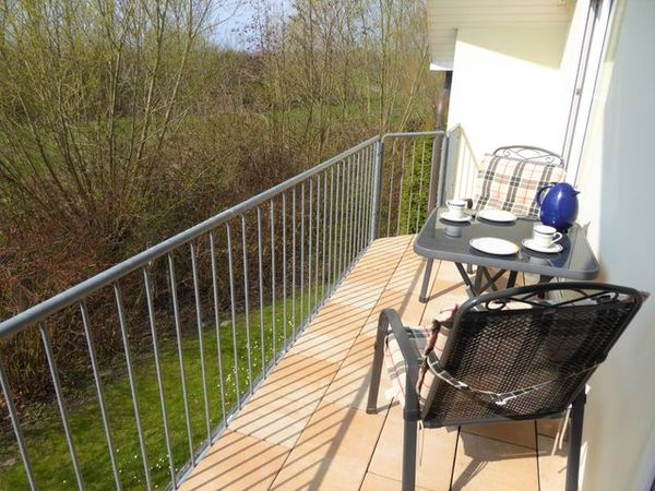 Die Ferienwohnung verfügt über ein Schlafzimmer mit Doppelbett und ein Wohnzimmer mit Schlafsofa für max. zwei Personen. Der große Balkon ist sowohl über das Wohnzimmer als auch das Schlafzimmer begehbar. Darüber hinaus gibt es eine moderne Küchenzeile mit Spülmaschine und einen Essbereich sowie ein Duschbad. WLAN, Bücher und Spiele stehen den Gästen in der Ferienwohnung zur Verfügung. Bettwäsche und Handtücher können gegen eine Gebühr dazu gebucht werden.