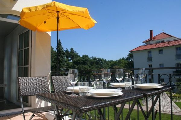 Sonnige Ferienwohnung für 2 - 3 Personen mit 2 Schlafzimmern und schönen möbliertem Balkon mit Blick zum Kurpark, WLAN vorhanden. Die Ferienwohnung liegt in der 1. Etage des  Hauses. Das erst 2013 neu eröffnete Haus Meeresblick mit Schwimmbad, Massage- und Saunabereich liegt direkt am Strand von Baabe.