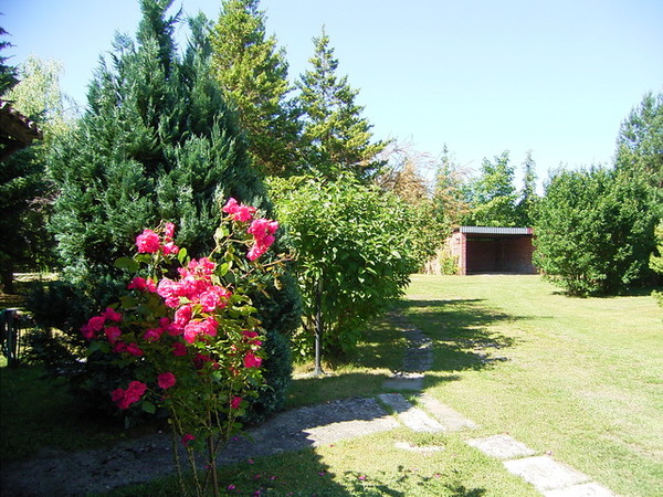 In der Nähe eines Bahnübergangs idyllisch am Waldrand gelegener, modern eingerichteter Bungalow, in großer gepflegter Gartenanlage (5000 m²), durch Hecken und Gebüsch vom Haupthaus abgegrenzt, in dem der Eigentümer wohnt.