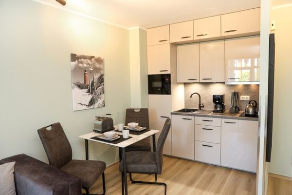 Die funktional gestaltete Ferienwohnung im Erdgeschoss hat einen offenen Wohnbereich mit Küchenzeile und Essbereich, ein Schlafzimmer mit Doppelbett und eine Terrasse. Die funktionale Küchenzeile ist mit 2-Platten-Kochfeld, Kühlschrank, Mikrowelle, Kaffeemaschine und div. Geschirr ausgestattet. Ein Bad  mit  Dusche, Waschbecken und WC komplettieren den guten Gesamteindruck der Wohnung.