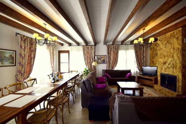 Das geräumige Wohn-Esszimmer ist hell und mit Kamin, Klimaanlage und SAT-TV.