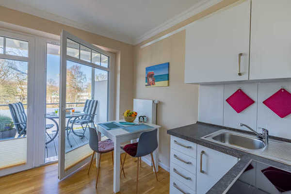 Unser ca. 26 qm großes Apartment Seepferdchen befindet sich im 2. Obergeschoss. Die Küche ist voll ausgestattet und im Bad liegt der Fön bereit – natürlich mit direktem Zugang zum Balkon.