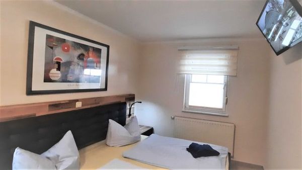 Der Bungalow Nr. 09 mit möblierter und überdachter Terrasse verfügt über ca. 43 qm und kann mit bis zu 4 Personen belegt werden. Es erwarten Sie zwei Schlafzimmer und ein Wohnzimmer mit kleiner Küchenzeile und ein Bad. Der gemütlich und modern eingerichtete Wohnbereich verfügt über eine Sitzgruppe, ein Flachbild-TV, Radio sowie WLAN. Die integrierte Küchenzeile ist mit Kühlschrank und Gefrierfach, 4 Kochfeld, Backofen, Geschirrspüler, Mikrowelle, Kaffeemaschine, Toaster und Wasserkocher ausgestattet. Das Hauptschlafzimmer begrüßt Sie mit einem Doppelbett, Nachttischen, TV sowie einem Kleiderschrank. Im zweiten Schlafbereich erwarten Sie TV, zwei Einzelbett und ein Kleiderschrank. Das Bad mit Fenster ist ausgestattet mit Dusche, Haartrockner und WC. Ein Stellplatz für Ihren PKW und Ihre Fahrräder ist am Objekt vorhanden.