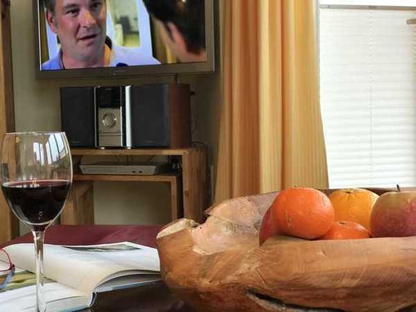 Düne unser Appartement mit einer Südterrasse und einer großen Westterrasse, einem Wohnraum mit SmartTV, DVD-Player, Wlan, einer kompletten Kochnische (im Wohnraum integriert) mit Spülmaschine, Mikrowelle, Kaffeemaschine u. Toaster, Dusche und WC, Fön, Zimmersafe, das Schlafzimmer mit Doppelbett und auf Wunsch ein Telefon.