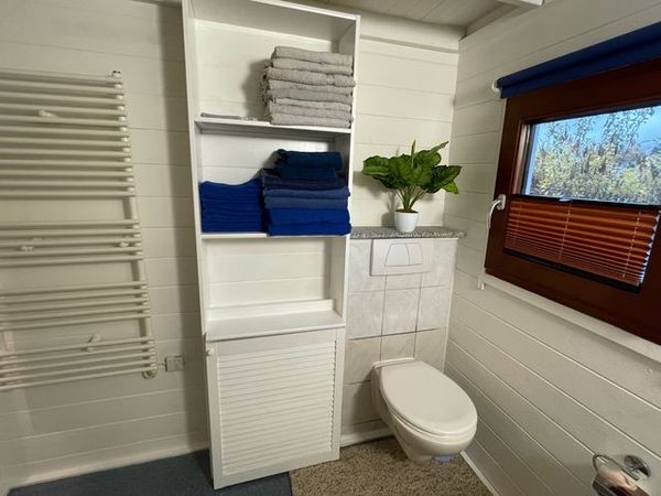 Die Besonderheit ist ein zusätzlicher offener Schlafboden (1,60m Liegefläche), der über eine stabile Leiter vom Wohnzimmer aus zu erreichen ist. Das Haus ist isoliert und gedämmt.