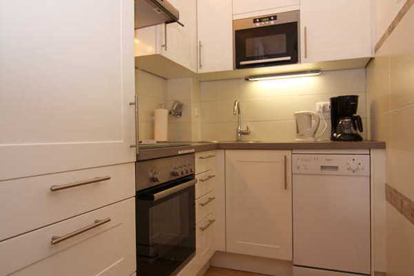 Die voll ausgestattete Küche, mit Herd, Geschirrspüler, Waschmaschine, Mikrowelle, Toaster, Kaffeemaschine etc. ist zum Wohnraum offen. Daran schließt sich eine Essecke mit 4 Stühlen an (bei Bedarf 6 Stühle).