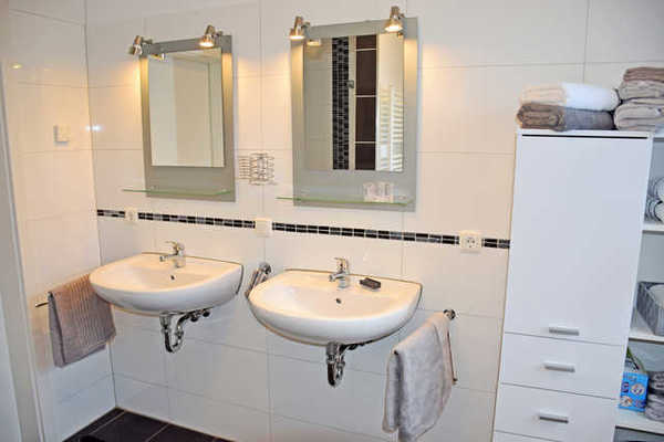 Das moderne große Bad ist mit Dusche, Badewanne WC, Fön und zwei Waschtischen ausgestattet.