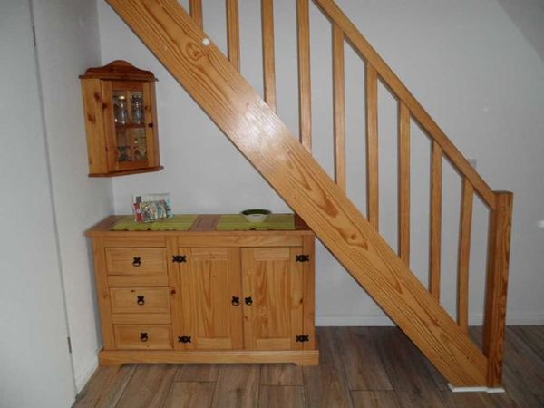 Ecksofa, Relax Sessel mit Fußteil, Hocker, Flach Bildschirm (Sat -TV ), Spiele, Bücher und W-Lan. Die Möbeln bestehen aus Pinien Holz ( Massiv )
