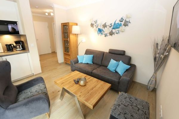 Urlaubsträume am Meer" für max. 3 Personen. Die Nichtraucherwohnung hat elektrische Rollläden, ist durchgehend gefliest und wird durch eine Fußbodenheizung versorgt. Im modern eingerichteten und lichtdurchfluteten Wohn-Essbereich finden Sie einen Esstisch mit bequemen Essstühlen, eine gemütliche Couch, einen Couchtisch sowie einen Ohrensesel mit Hocker, Leselampe und einer Vitrine. Die Wohnung verfügt über zwei Smart-TV´s, ein Radio mit CD-Player mit Bluetooth/USB Möglichkeit und einen Internetanschluss (WLAN). Dieser ist für Sie inclusive. Die angrenzende Küchenzeile ist mit einem Geschirrspüler, einer Mikrowelle, einem Backofen, einem Kühlschank mit integriertem Gefrierfach, einer Kaffeemaschine, eine Senseo Padmaschine, einem Toaster, einem Wasserkocher sowie diversen Küchenutensilien ausgestattet. Vom Wohnbereich aus gelangen Sie auf die Süd-Terrasse mit komfortabler Bestuhlung und Sonnenschirm sowie mit kleinem nutzbaren Gartenanteil mit ca. 70qm. Die Wohnung hat 2 Schlafzimmer, eines verfügt über ein Doppelbett (1,60 m x 2,00 m), 2 Nachttischablagen, eine Kleiderablage und einen Drehtürenschrank und eines mit einem Einzelbett (0,90 m x 2,00 m), Nachttischablage, Kleiderablage, Kleiderschrank und einen Smart-TV. Durch elektrische Rollläden und Insektenschutzgitter haben Sie eine angenehme Nachtruhe. Das Badezimmer ist mit einer ebenerdigen Regendusche, einem Waschtisch, einem WC, einem Fön, einen Kosmetikspiegel und einem Handtuchtrockner ausgestattet. Durch ein Gäste-WC mit Waschtisch wird der Sanitärbereich abgerundet. Im Flur gibt es eine Garderobe mit Spiegelfront und den wohnungsinternen Abstellraum, in dem sich Dinge wie Wäscheständer, Staubsauger und weitere Reinigungsutensilien befinden. Maximal 2 Haustiere sind gegen eine Gebühr willkommen. Im Untergeschoss des Hauses befindet sich ein Wellnessbereich mit einer Gemeinschaftssauna, ein Waschraum mit Waschmaschine und Trockner, die Sie gegen Gebühr nutzen können und auch bequem mit dem Fahrstuhl erreichen können. Ein eigener PKW-Stellplatz (Nr. 25/Urlaubsträume am Meer) befindet sich direkt am Haus. Ihre mitgebrachten Fahrräder können Sie am Haus abstellen. Die Erstausstattung eines Wäschepaketes (komplette Bettwäsche, 1 Duschhandtuch, 2 kleine Handtücher) können Sie bis 14 Tage vor Anreise dazu buchen oder durch eigene ergänzen. Ab 2 gebuchten Paketen erhalten Sie einmalig 1 Geschirrhandtuch und 1 Duschvorleger.