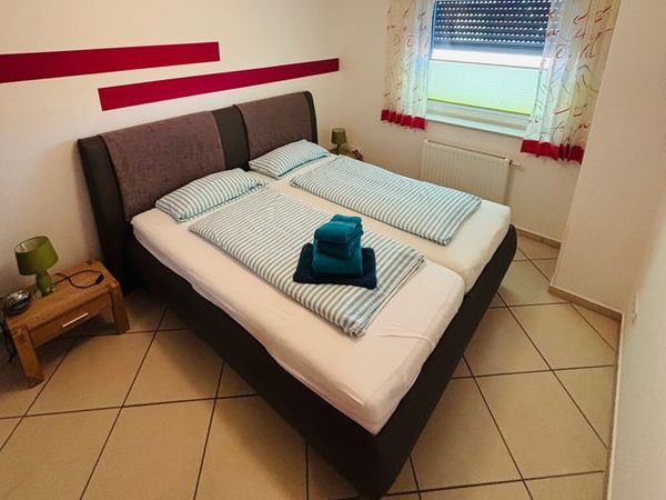 Das erste Schlafzimmer ist mit einem Boxspringbett ausgestattet, das zweite Schlafzimmer mit zwei Einzelbetten und einem weiteren Fernseher.