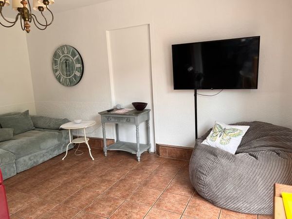 EG: Küche mit Essplatz, WZ mit Ledersitzecke, Schaukelstuhl, Kaminofen, Du/WC, große Terrasse mit Sonnenschutz,