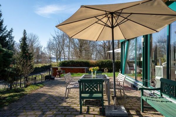 Die Terrasse schließt direkt an den Wohnraum an und bietet einen freien Blick ins Grüne perfekt für den ersten Kaffee am Morgen oder einen entspannten Abend mit einem Buch.