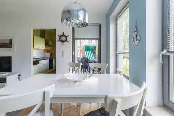 Die moderne Küchenzeile befindet sich räumlich etwas abgeteilt und bietet Ihnen eine komplette Ausstattung für eine ideale Selbstversorgung. Auf der Terrasse finden Sie, liebe Gäste, Gartenmöbel und einen wohnungseigenen Strandkorb. Urlaub direkt in unmittelbarer Strandnähe mit Ostseeflair.