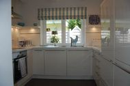 Die Großzügigkeit des Ferienhauses bilden die großen bodenlangen Fenster und der offene lichtdurchflutete Wohnbereich in dem Wohnen, Essen und Kochen ineinander übergehen. Hauptakteur für Harmonie und Helligkeit ist die Farbe des Lichtes strahlendes Weiß. Mit viel Liebe zum Detail wurden Accessoires, Bilder und klassisch-moderne Möbel perfekt auf einander abgestimmt und sorgen für Ruhe und Gemütlichkeit.