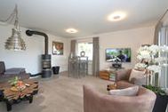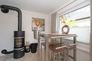 Ein helles Wohnzimmer mit großer Fensterfront zur möblierten Terrasse, Kaminofen. TV SAT/Kabel, Radio, Sofa.Bartresen.