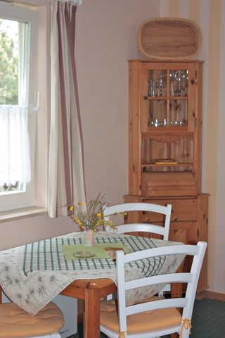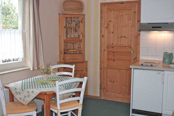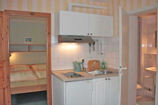 Diese Ferienwohnung befindet sich im Erdgeschoß auf der Nordseite des Hauses und hat eine Größe von ca. 27 m². Sie ist aufgeteilt in einen Schlafraum, Wohnraum mit Küchenzeile und Bad mit Dusche und WC. Das Doppelbett im Schlafzimmer hat eine Größe von 1,60m x 2,00m. Im Wohnzimmer steht, falls eine Aufbettung gewünscht wird eine Doppelbettcouch. Zur Wohnzimmerausstattung gehören außerdem W-LAN, ein Fernseher, Radio mit CD-Player und ein Telefon mit eigener Nummer. Die Küche hat folgende Ausstattung, Cerankochfeld, Kühlschrank mit kleinem Gefrierfach, Kaffeeautomat, Wasserkocher, Toaster sowie div. Geschirr und Küchenutensilien.
