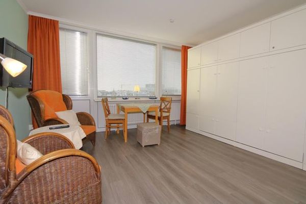 Im Wohnzimmer des Appartements stehen 2 Sessel und vor dem Fenster der Essplatz mit dem weitem Blick über die Stadt Richtung Nordsee. In einer Schrankwand sind zwei einzeln aufklappbare zusammenstehende Schrankbetten untergebracht. Die Küchenzeile ist zum Wohnzimmer hin offen. Das Bad hat eine Dusche.
