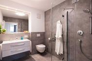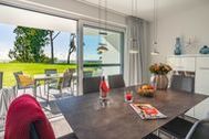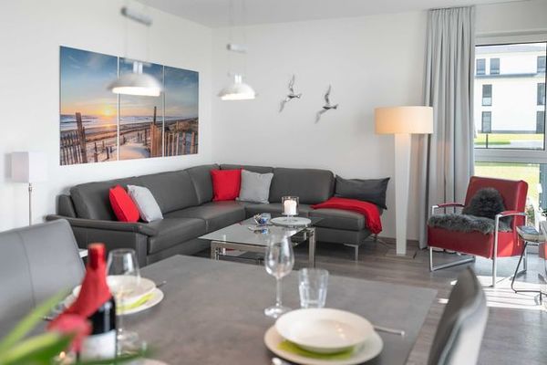 Diese luxuriöse 4-Zimmer-Wohnung im Erdgeschoss von Haus 6 mit Platz für maximal 6 Personen verfügt über eine Wohnfläche von 100 m² und hat 3 Schlafzimmer sowie 2 voll ausgestattete Duschbäder. Die große Sonnenterrasse mit 21 m² liegt in idealer Süd-Ausrichtung. Die Wohnung ist modern eingerichtet mit offenem Wohn-Essbereich, großem Esstisch, Ledersofa sowie Smart-TV (inkl. Sky-Abo). Die hochwertig ausgestattete Küche, offen zum Wohnbereich, lässt keine Wünsche offen. Erholsamer Schlaf in den beiden Schlafzimmern mit Boxspringbetten und Smart-TV ist garantiert. Im dritten Schlafzimmer befindet sich ein bequemes Schlafsofa (Liegefläche: 1,60 x 2,00 m) und ein Smart-TV. Das Badezimmer en Suite ist mit einer begehbaren Dusche ausgestattet. Auf der großen, überdachten Sonnenterrasse mit Essgruppe und jeweils zwei Relax-Sesseln, Fußhockern, Sonnenschirm und Sonnenliegen können Sie die Seele baumeln lassen.