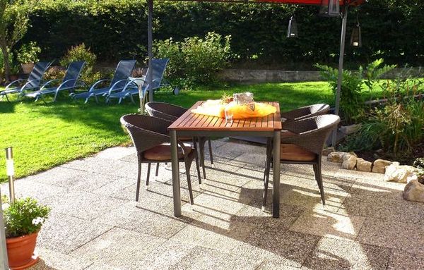 Auf dem teilweise überdachten und windgeschützten Balkon oder auf der Terrasse oder Liegewiese im Garten können