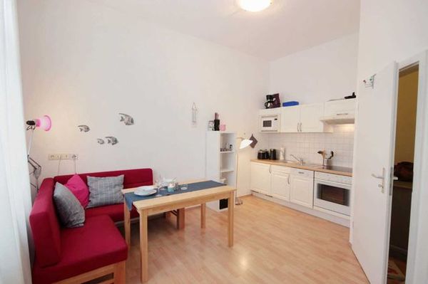 Im kombinierten Wohn- und Schlafraum befindet sich eine komplett ausgestattete Küchenzeile mit Geschirrspüler, Backofen, Ceranfeld, Kühlschrank, Mikrowelle, Kaffeemaschine, Wasserkocher und Toaster. Der Schlafbereich erwartet Sie mit einem französischen Doppelbett und einen Kleiderschrank als Raumteiler.