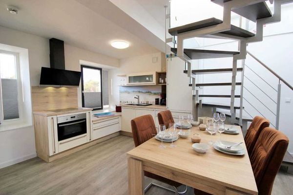 Die großzügige Wohnung verfügt über einen vorgelagerten Flur mit Garderobe und separatem Duschbad. Angrenzend erwartet Sie die schöne Wohnküche mit separatem Essbereich. Über eine Wendeltreppe erreichen Sie die wohnungseigene Dachterrasse, die zum gemeinsamen Verweilen und Sonnenbaden einlädt. Der Wohnbereich, mit Zugang zum Balkon, ist mit einer bequemen Sitzgruppe, WLAN und Flachbild-TV ausgestattet. Im Küchenbereich erwartet Sie ein Backofen, Cerankochfeld, Geschirrspüler, Kühlschrank mit Tiefkühlfach, eine Kaffeemaschine, Wasserkocher, Toaster sowie umfangreiches Kücheninventar.