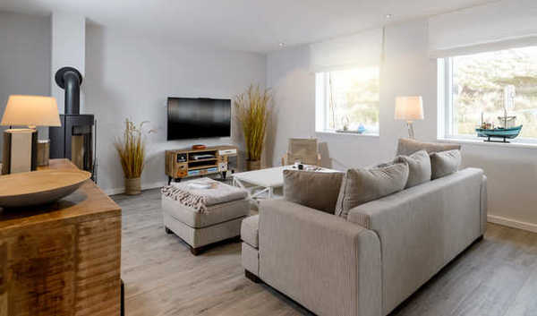 Das Sylt Hüüs verfügt über einen Eingangsbereich von dem aus Sie direkt in den großzügigen Wohn-Essbereich mit offener Küche gelangen. Ein Kaminofen lädt auch im Winter zur Gemütlichkeit ein.