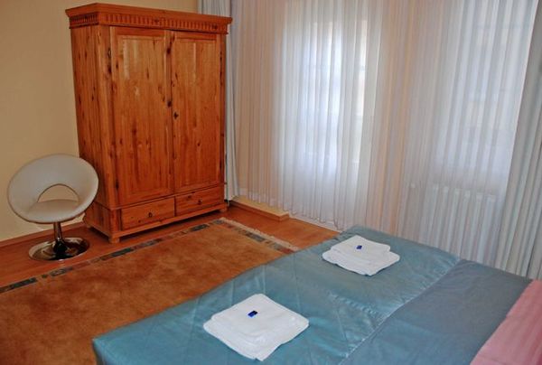 Die Ferienwohnung liegt im Hotelgebäude und verfügt über einen separaten Eingang. Sie ist ca. 36 qm groß, hat Platz für maximal 3 Erwachsene und wurde modern und hochwertig eingerichtet. Im Wohnraum befinden sich eine bequeme Sitzcouch mit Tisch und ein modernes Flachbild-TV-Gerät. Hier steht auch ein Esstisch mit Stühlen. Die moderne Küchenzeile ist mit einem Herd, Mikrowelle, Wasserkocher, Kaffeemaschine, Toaster und Kühlschrank komplett ausgestattet. Das großzügige Schlafzimmer ist mit einem bequemen Doppelbett mit Nachttischen und Leselampen sowie einem Kleiderschrank ausgestattet.