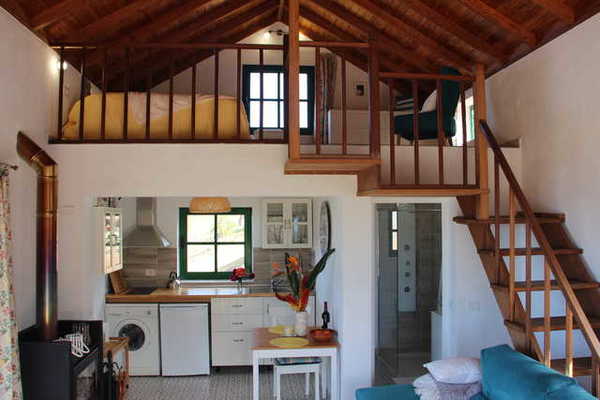 Dieses gemütliche Haus mit Meerblick verfügt über ein Schlafzimmer, welches auf einer Empore über dem geräumigen Wohnzimmer mit voll ausgestatteter Küche liegt. Der Wohnbereich ist durch seine zwei großen Fensterfronten zur Terrasse und zum Garten sehr hell. Ein Kamin sowie ein zusätzlicher Elektroheizer sorgen auch im Winter für eine angenehme Temperatur im Haus. Neben einem hochwertigen Sofa stehen den Gästen selbstverständlich Sat-Im TV und Internet zur Verfügung. Im Anschluß an das Wohnzimmer befindet sich das Badezimmer mit Dusche (Massagedüsen), WC und Heizstrahler. Die Raumelemente sind perfekt aufeinander abgestimmt. Auch ein kleiner Sekretär mit schönem Spiegel findet seinen Platz. Man genießt den Blick ins Grüne und auf das Meer.