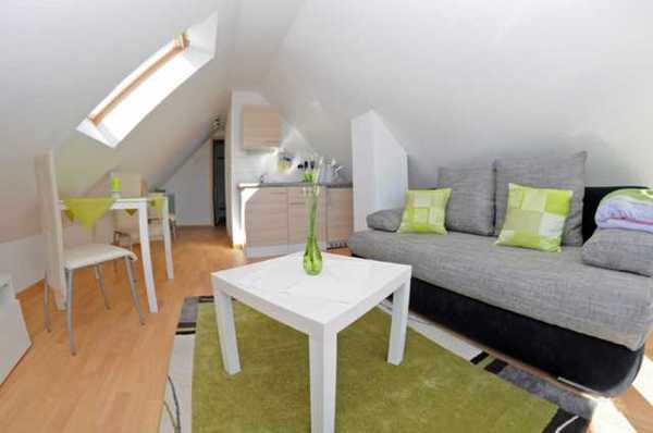 Das kleine 1 Zimmer Dachgeschoss - Appartement im Ferienhaus Müritzlust verfügt über 1 kombinierten Wohn- und Schlafraum, kleiner Essbereich mit Tisch und 2 Stühlen, kleines Wannenbad mit WC, TV, Pantryküche, möbilieten Balkon und guter Schlafcouch. Die rund 25 qm große Ferienwohnung kann mit bis zu 2 Personen belegt werden.