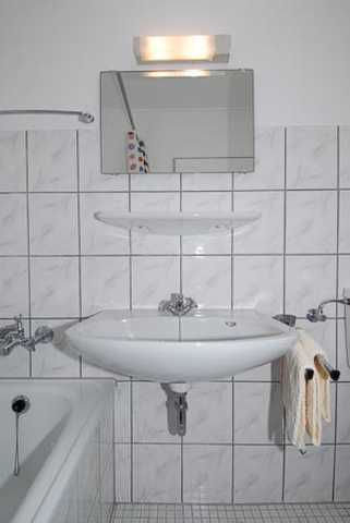 Badezimmer mit Badewanne (mit Dusche), Waschtisch und WC
