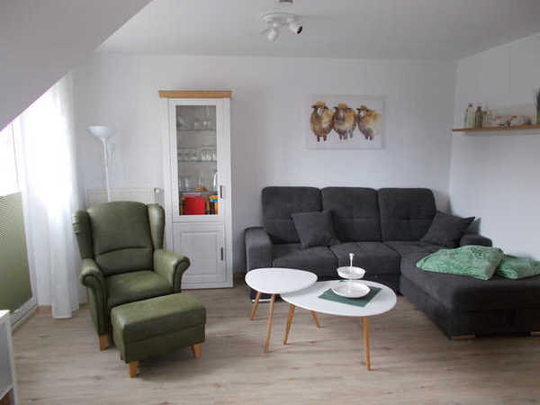 Der gemütliche Wohnbereich mit Eckgarnitur (Schlafsofa für eine Person), Ohrensessel samt Fußhocker, LCD-TV, Blu-ray-Player und Radio-CD-Anlage lädt zum Verweilen ein. Bücher, Spiele, Blu-rays und Kabel-TV sorgen für Unterhaltung.