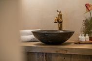 Sanitär: bodenebene Dusche, Föhn, Handtuchheizkörper, Schminkspiegel.