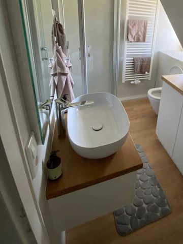 Sanitär: bodenebene Dusche, Föhn, Handtuchheizkörper, Schminkspiegel.