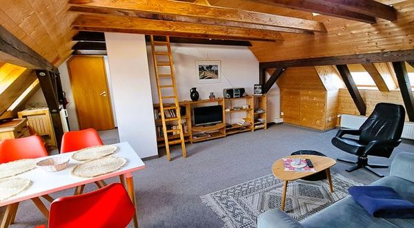 Die Dachgeschoss-Ferienwohnung bietet Ihnen ein Wohnzimmer mit Couch, Esstisch und FlachTV. Dort befindet sich auch ein Spitzboden mit Leiterzugang, wo eine dritte Person schlafen kann. Diese Schlafkoje mit Matratzenlager hat eine Stehhöhe von 145 cm; sie besitzt kein Geländer, weshalb sie nur für ältere Kinder geeignet ist. Im Schlafzimmer finden Sie 2 Einzelbetten (100 x 220 cm) und einen Kleiderschrank vor. Das Badezimmer ist ausgestattet mit Dusche, Waschtisch, WC und Waschmaschine. Die Küchennische (offen zum Wohnzimmer) hat ein Cerankochfeld mit Backofen, Mikrowelle und Spüle. Der Zugang zur Dachterrasse ist über einen Ausstieg durch ein Dachfenster gegeben. Die Wohnung hat durch die Dachgeschosslage Ihren ganz eigenen gemütlichen Charme.