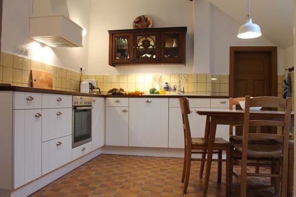 Es gibt Betten für max. 7 Erwachsene, plus ein kürzeres Bett (Länge 1,80m) und ein Kinderbett. Es gibt 5 Schlafzimmer: Das Bauernzimmer mit Doppelbett (und Sat-TV), das Gartenzimmer mit zwei zusammenstehenden Einzelbetten, die grüne Stube mit einem Tagesbett (ausziehbar zum Doppelbett, Breite 1,60m), die Knechtkammer mit einem Einzelbett (Matratze 100x200cm). In der Knechtkammer steht hinter einem Vorhang die Waschmaschine. Im kleinen Zimmer gibt es ein kurzes Einzelbett (Matratze 90x180cm) und ein Kinderbett (60x120cm). Die Ferienwohnung verfügt über ein Wannenbad mit Fußbodenerwärmung mit Toilette, ein Duschbad mit Fußbodenerwärmung ohne Toilette und ein separates WC. Große Wohndiele mit alter Holzbalkendecke, Esstisch für bis zu 8 Personen, Sofaecke mit Sat-TV, Klavier (zur Zeit leider nicht gestimmt), vollausgestattete neue Küche mit allem Komfort, Esstisch (ausziehbar) mit 4 Stühlen, W-LAN.