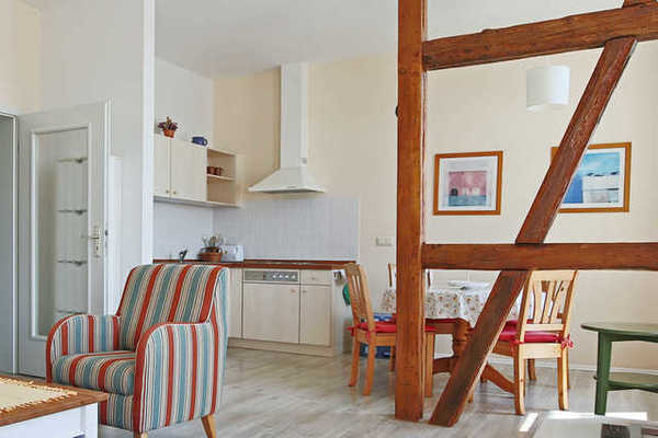 Die Ferienwohnung im 1. Obergeschoss hat eine gemütliche und moderne Ausstattung und einen Panoramablick auf den Yachthafen und die Binnenmüritz vom Wohnzimmer aus. Das Wohnzimmer ist ausgestattet mit einer Einbauküchenzeile, Esstisch für alle Personen, Schlafsofa (Aufbettung 3. Person) und FlachTV. Der Schlafraum befindet sich auf der Hofseite mit zwei Einzelbetten, Nachttisch, Leselampe und Kleiderschrank. Auf Anfrage stehen Kinderbett und Hochstuhl für Kinder bis 3 Jahren zur Verfügung (Bitte vor Anreise absprechen).